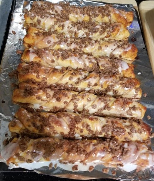 BREAKFAST: Ants on a Log, each log made from two canned cinnamon rolls (regular size), unrolled, twisted together, baked, iced, and sprinkled with cocoa crispy rice cereal. And our own lovely, healthy version of The Ants Offering to the Grasshoppers, made from oat granola, assorted nuts, dried fruit, sunflower seeds, and fresh blackberries (boysenberries were used in the movie, but we adapt with what we have!).