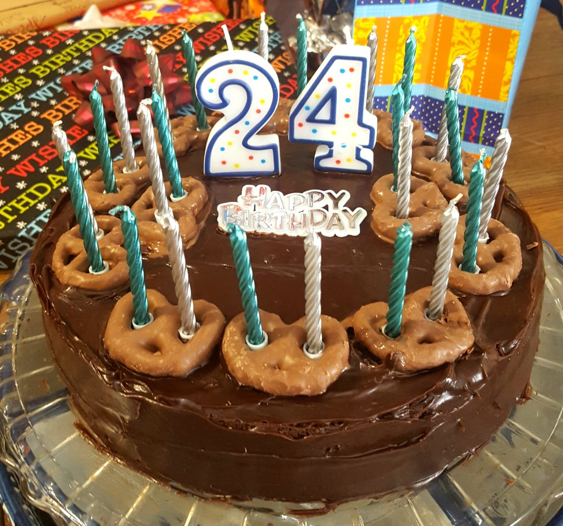 DINNER: Celebrating Mr. Potato Head – of course! – we had a Chili Baked Potato. This was an easy item to choose since it is a long-time favorite at our house. The potato is baked, sliced open while hot, covered in chili, topped with cheese (bacon bits, optional), and reheated to warm the chili and melt the cheese. That cute little 6″ cake with pink frosting was decorated by Maggie and inspired by Molly’s 2nd birthday in Toy Story 3. Under that frosting, the cake is gluten-free chocolate – not that anyone cared at this point since the GF goals were blown for the day, but GF flour is all we have in the house.